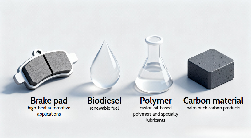 | Jatropha Oil | Triglycerides | Biodiesel, lubricants | Good for biofuel conversion | Not suitable for high-heat friction materials |