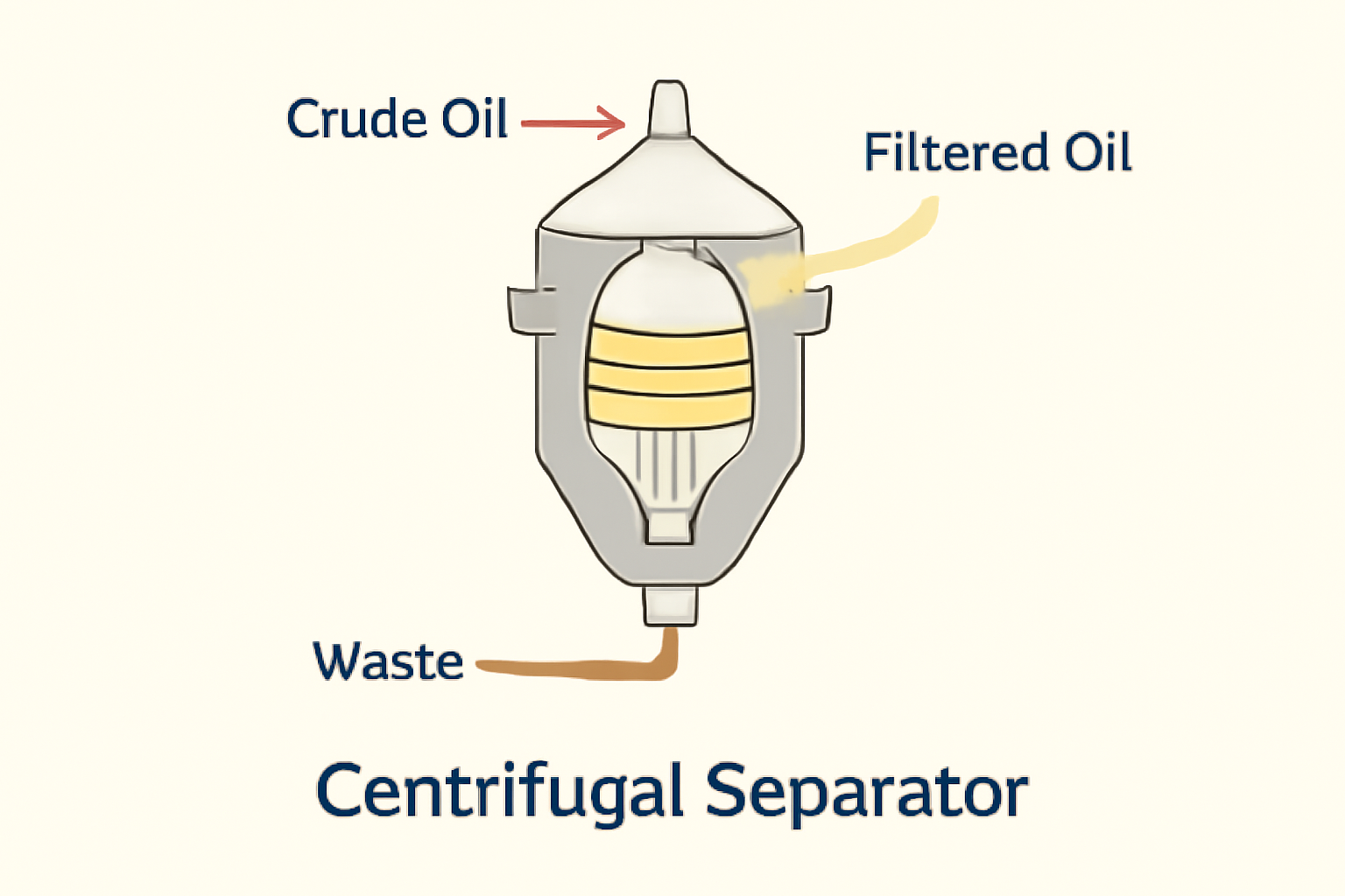 High-speed centrifuge spins oil to separate moisture and impurities.
