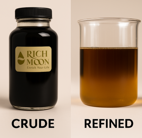 💡 Rich Moon’s refining process uses controlled heating and purification to maintain the oil’s natural properties while enhancing its industrial strength and color clarity.