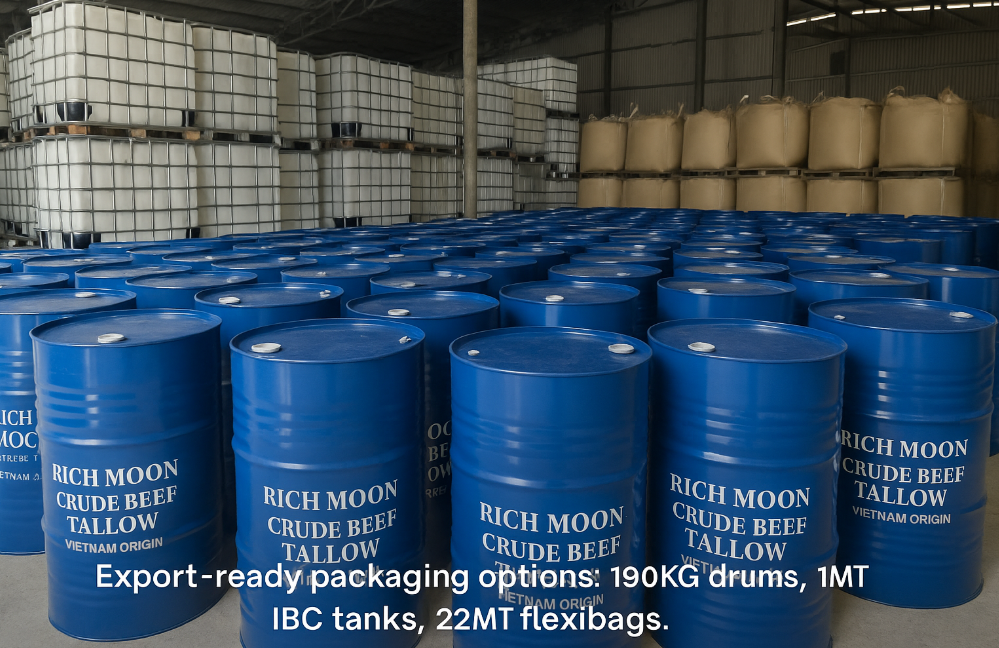 Rich Moon supplies crude beef tallow in multiple packaging formats: