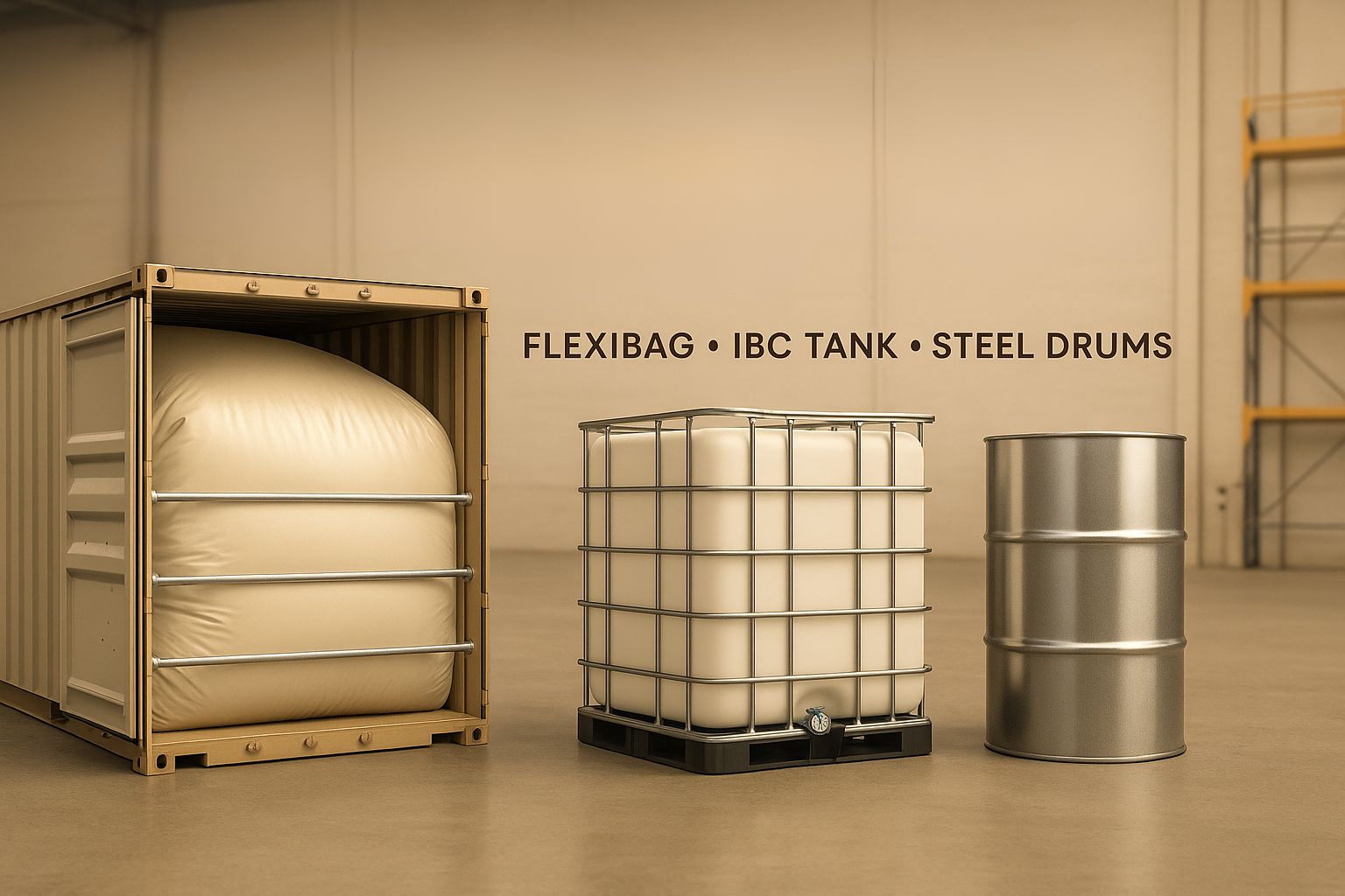 IBC tanks, flexibags, and steel drums are commonly used depending on the order size.